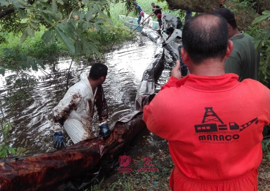 Nanchital, Ver. – Elementos de Protección Civil Municipal de Nanchital, colaboran con personal de Petróleos Mexicanos (PEMEX) en la remediación del derrame hidrocarburo que se registró en el Arroyo Mezcalizapa del municipio de Ixhuatlan del Sureste, el cual pasa a un costado de la colonia Residencial Seccion 11.