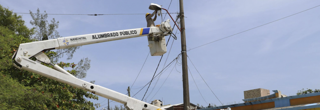 Personal de alumbrado público ejecuta un programa de cambio de luminarias en las colonias de Nanchital, modificando las de vapor de sodio a lámparas de espiral ahorradoras.