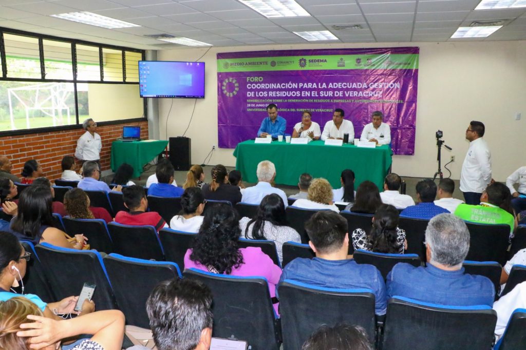 Nanchital, Ver. – La mañana de este miércoles, la Universidad Tecnológica del Sureste de Veracruz (UTSV) fue sede del Foro “Coordinación para la Adecuada Gestión de los Residuos en el sur de Veracruz”, el cual fue encabezado por el Ing. Juan Carlos Contreras García, Secretario del Medio Ambiente, la Alcaldesa Esmeralda Mora Zamudio y el Mtro. Julio César Sandria Reynoso, Rector del plantel.