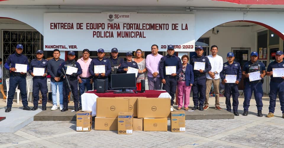 Nanchital, Ver. – Para fortalecer las tareas preventivas de seguridad, en beneficio de las familias nanchitecas, esta mañana autoridades municipales encabezadas por la Alcaldesa Esmeralda Mora Zamudio, llevaron a cabo la entrega de más equipamiento, así como certificados a los elementos de la Policía Municipal. Fue en el Parque Central Benito Juárez, en dónde los…